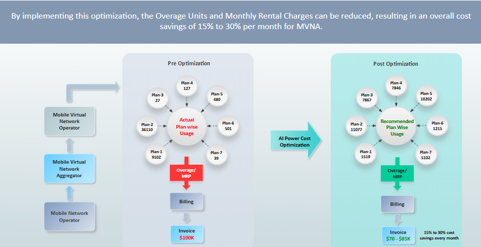 Once optimal plan migrations are determined, the AI engine automatically provisions and reallocates plans via MNO/MVNA/E APIs for seamless execution.